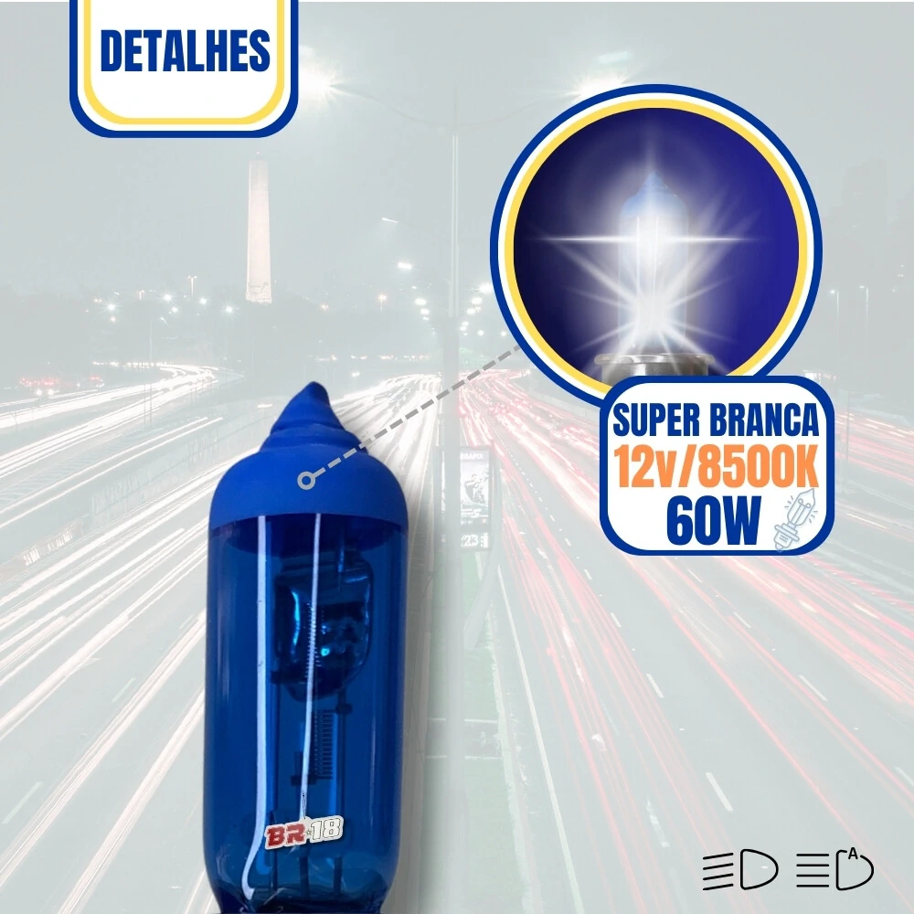 Ele equipa seu possante sob medida, já que conta com encaixe no modelo HB3, além de possuir temperatura de cor de 8500K e potência de 55W.
